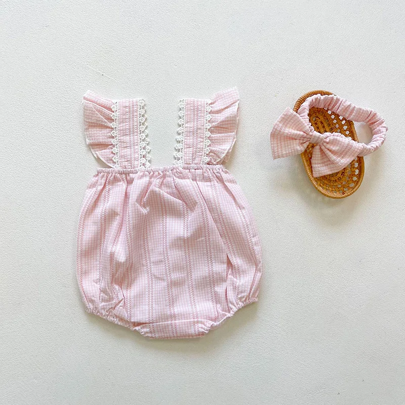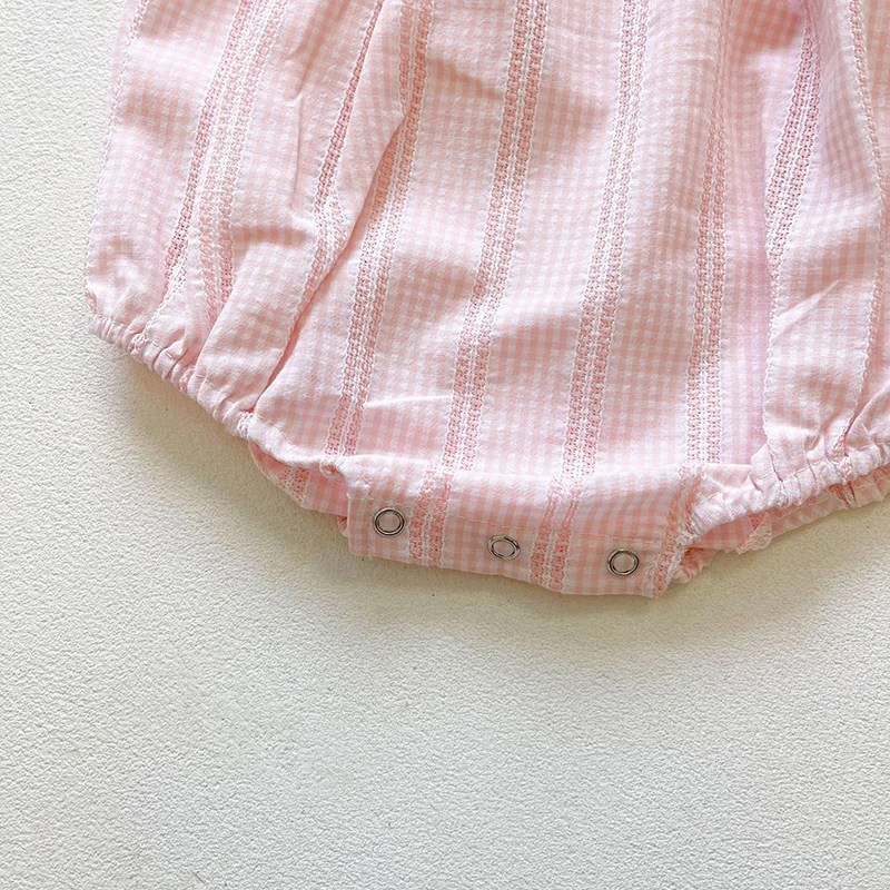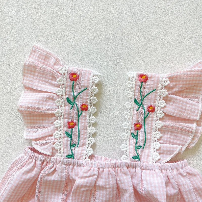 This gorgeous floral embroidered baby romper features a pink checkered print, ruffled sleeves with embroidered detail. This romper also comes with a matching headband. Perfect for your lovely little ones especially during the summer.